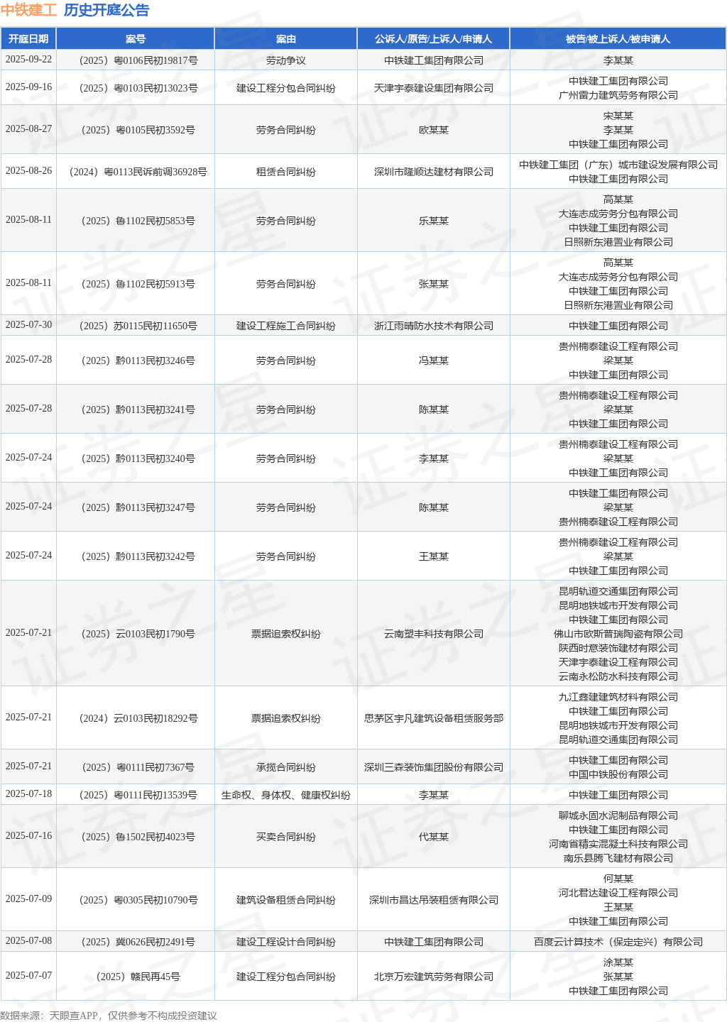 案号:(2025)赣0732民初2262号审理法院:兴国县人民法院案由:建设工程施工合同纠纷当事人信息: 原告/上诉人:湖北梦都建筑劳务有限公司 被告/被上诉人:中铁建工集团有限公司开庭日期:2025年6月19日根据统计,近一年内以中铁建工集团有限公司为当事人的历史开庭公告有683则,其中案由为“买卖合同纠纷”的公告以116则居首,其次为“建设工程施工合同纠纷”有113则,“劳务合同纠纷”有96则。历史开庭公告(前20条)如下: